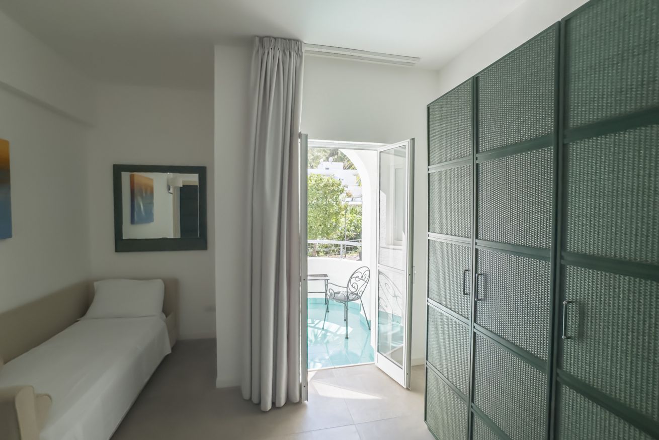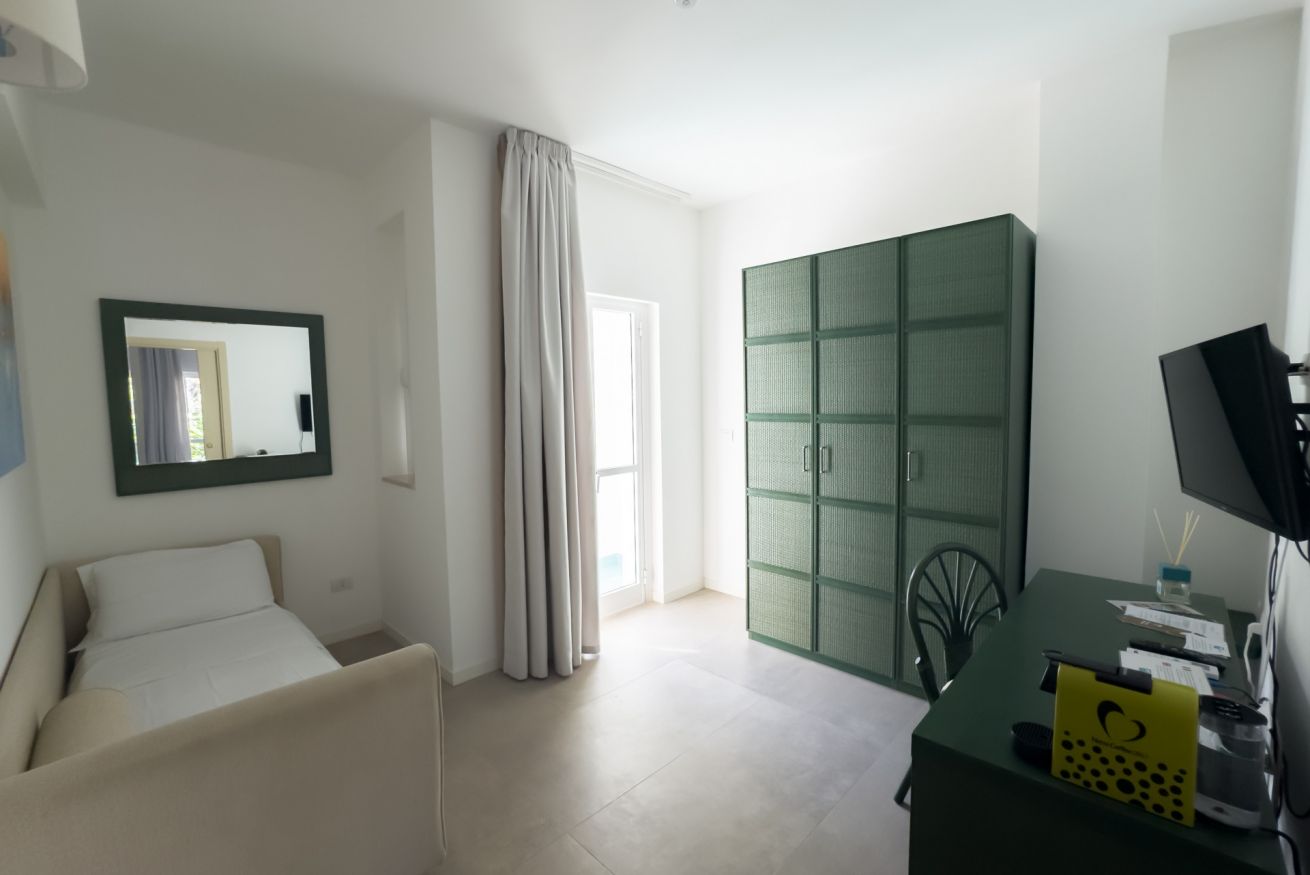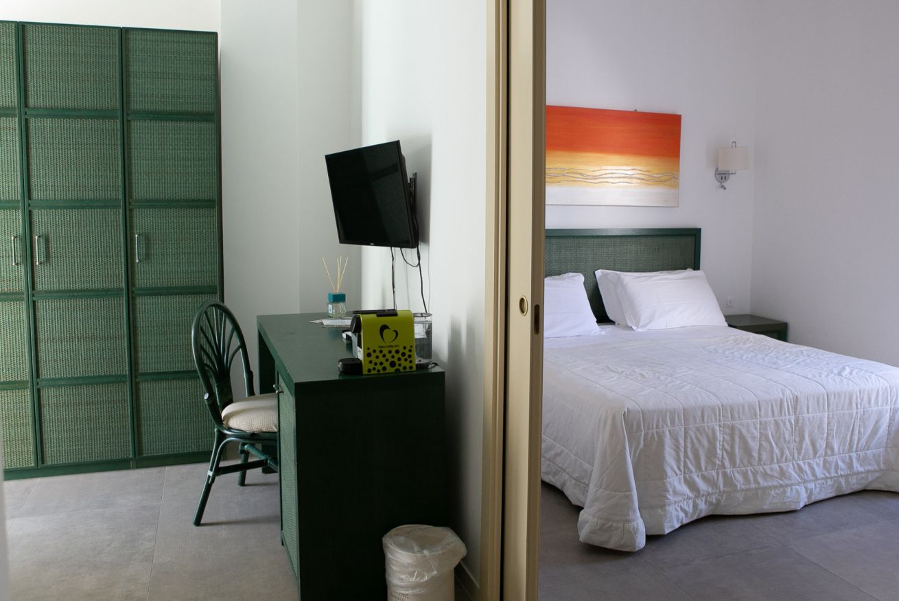 Finemente arredate dispongono di balconcino e due ambienti separati, di cui una stanza con letto matrimoniale e bagno privato; seconda stanza con due letti singoli e bagno privato. Tutte le camere dispongono di climatizzatore, frigo bar, phon, tv, servizi con doccia e cassaforte. Adatte a famiglie composte da massimo 4 persone